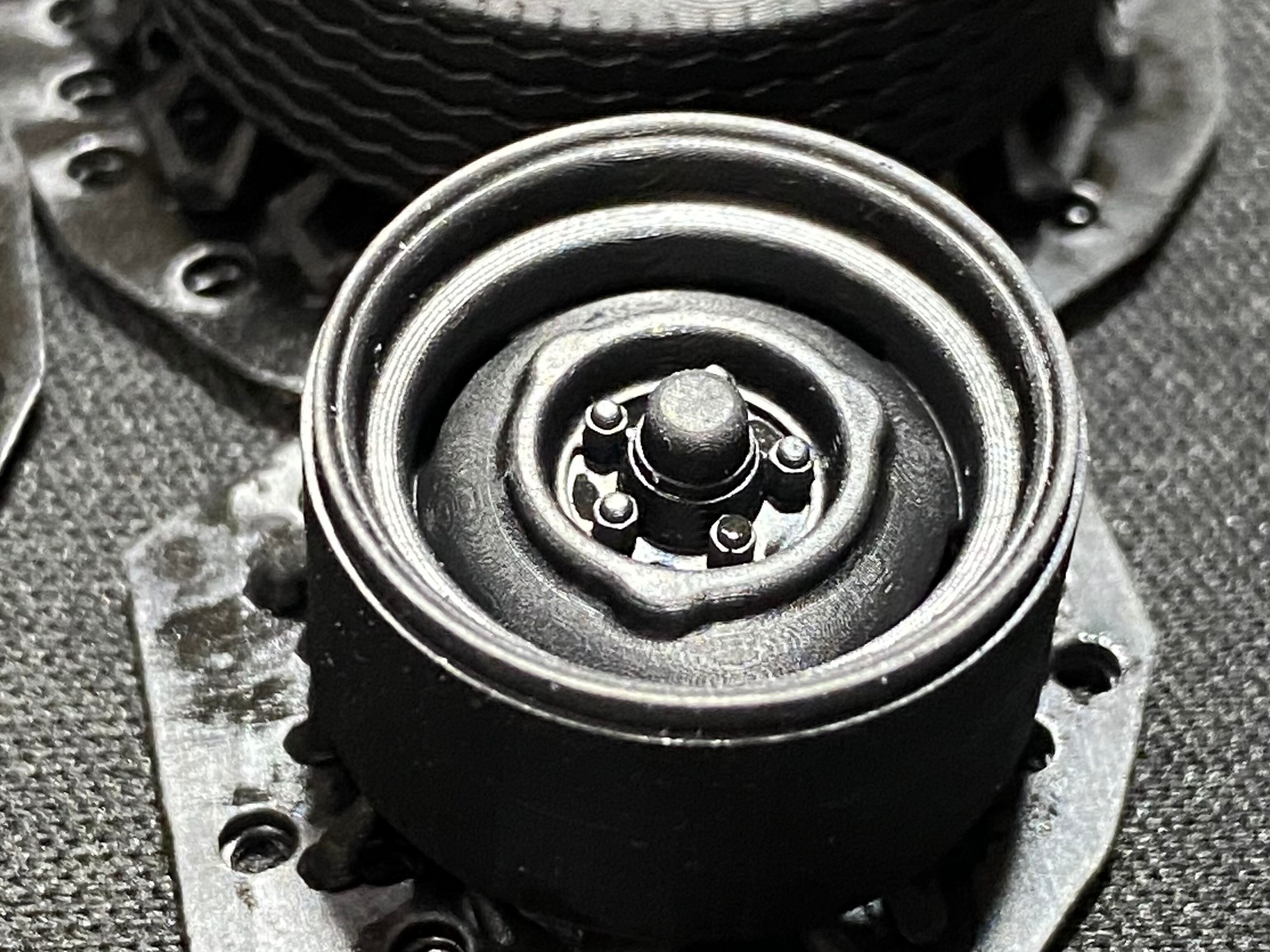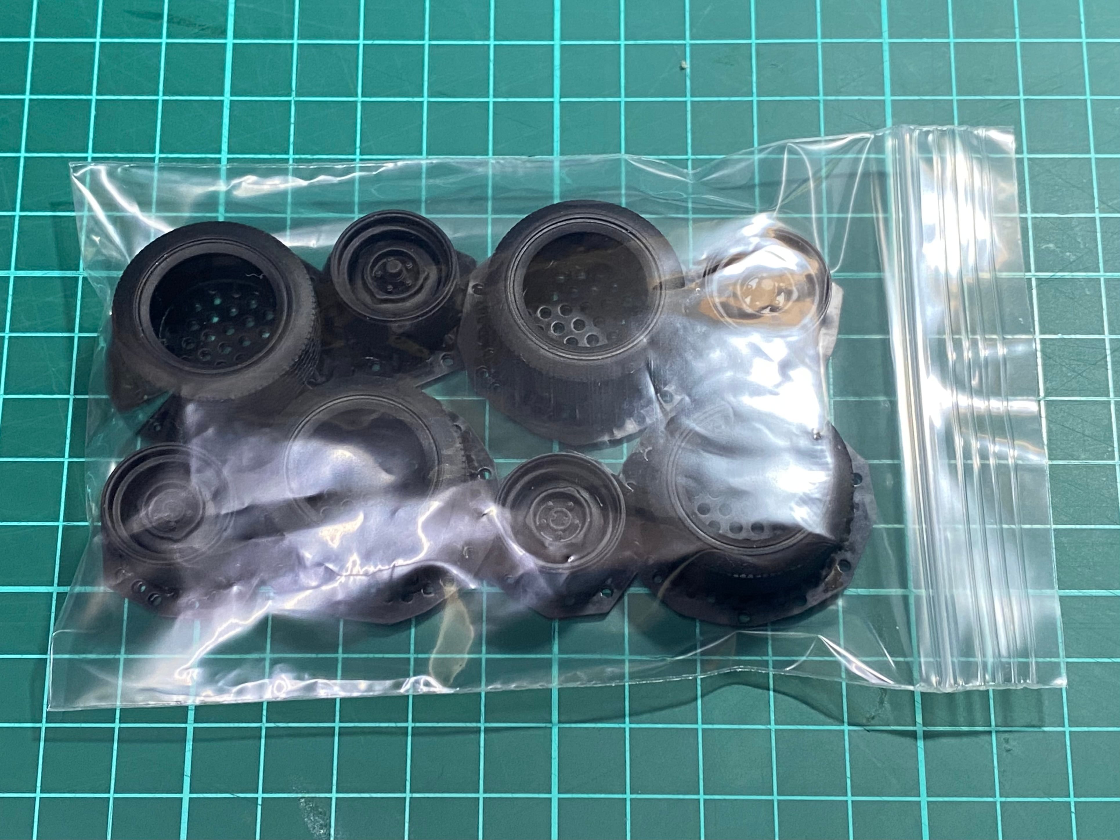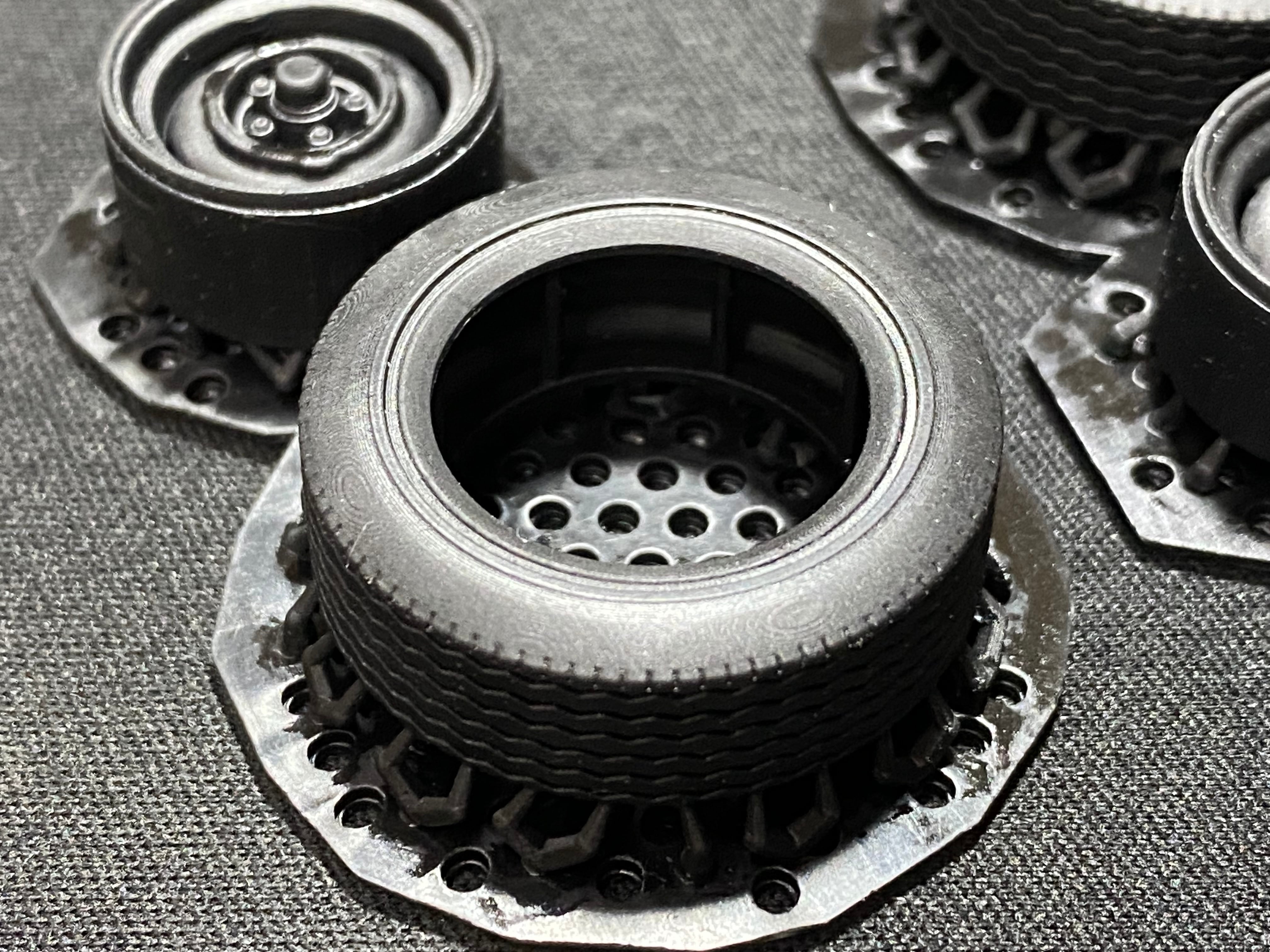 そのままでもゴムタイヤの質感に近い感じの色艶です。もちろん従来のレジンパーツ同様、下地にサーフェイサーを吹けばお好みで塗装も可能です。