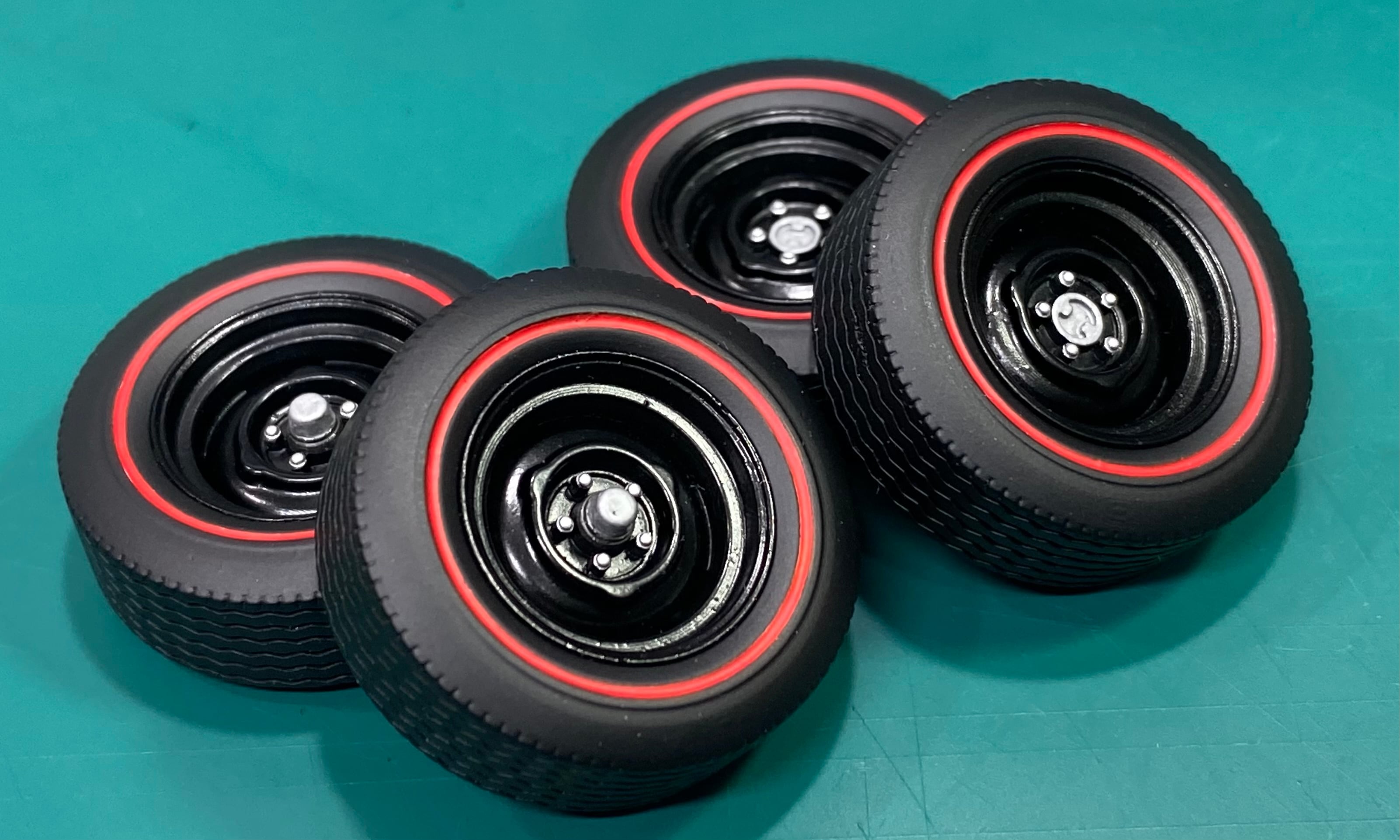⚫︎お届けするのは画像3〜7枚目、1台分のタイヤとホイール、そしてエンジンルームのディテールアップに役立つプラグコードの配線用穴を開けたディストリビューター(8気筒用)4個となります。