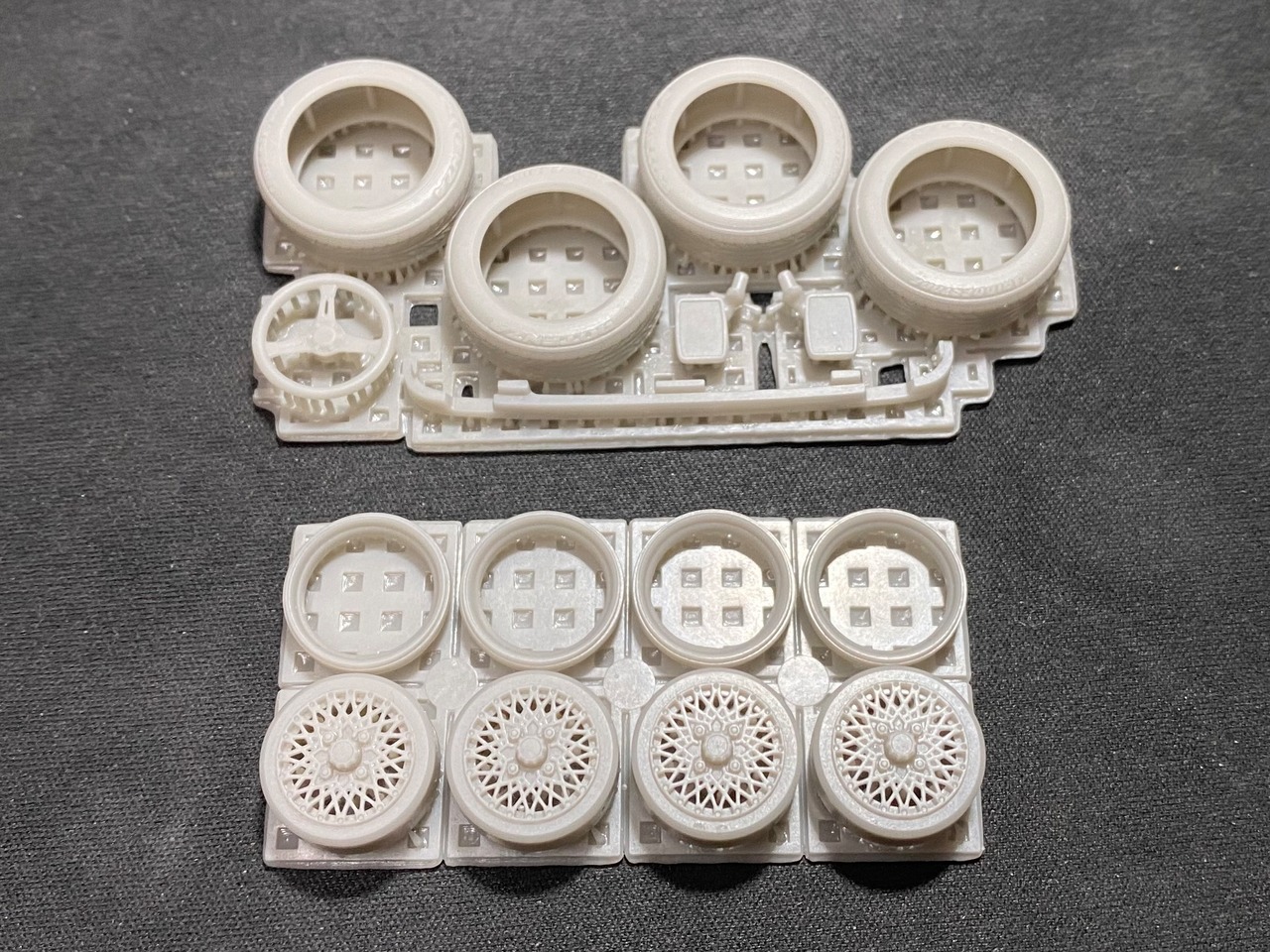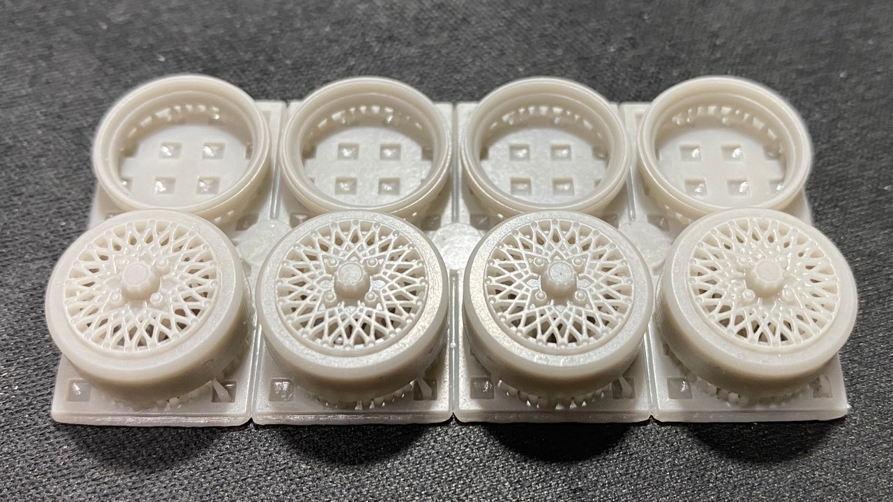 実際にお届けするのは画像7〜9枚目、無塗装のタイヤとホイール、カスタムパーツ1台分となります。